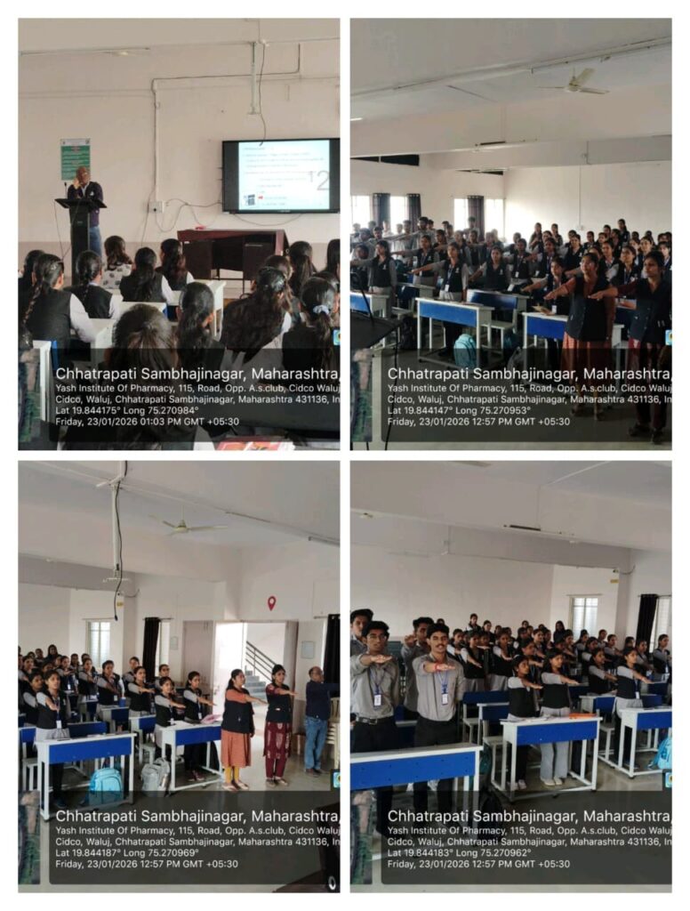Yash Institute of Pharmacy organized a Voters’ Day Pledge Program on 23 January 2026 at 1:00 PM for B. Pharmacy students. The pledge was led by Miss Danisha Rajput. Dr. Vinod Udawant addressed students, highlighting ethical voting and youth responsibility in democracy.