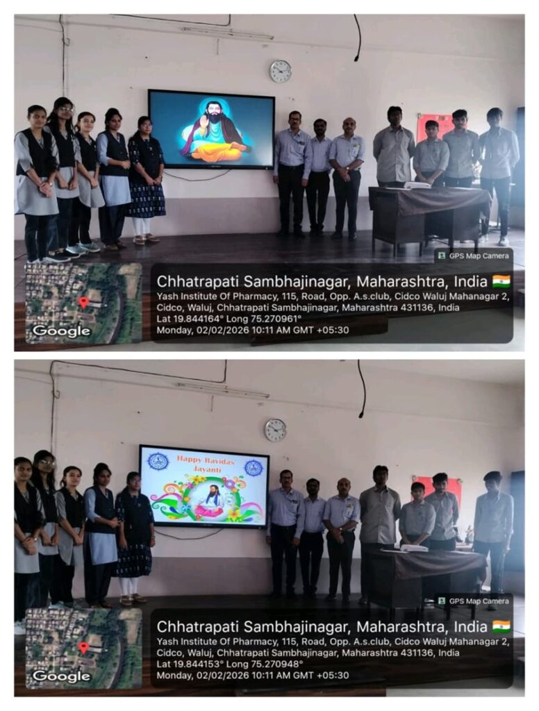 The Yash Institute of Pharmacy observed the Birth Anniversary of Sant Ravidas Maharaj by offering a floral tribute on 2/2/2026 at 10.15 Am in the Seminar Hall. The programme was organized with the objective of paying respectful homage and commemorating the life, contributions and ideals of the great personality. The principal, faculty members and students were present for the ceremony and participated with reverence and discipline, reflecting the institute’s commitment to value-based education and national ethos.