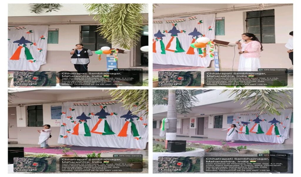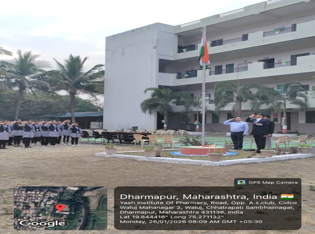 Republic Day was celebrated with great enthusiasm on 26 January 2026 at Yash Institute of Pharmacy. The programme began at 8:00 a.m. with flag hoisting by the Chief Guest, Mr. Punamsingh Krishansingh Bhendarwal, a retired Junior Commissioned Officer. B. Pharmacy students, faculty, and staff were present. A cultural programme featuring patriotic songs, speeches, and dance performances highlighted national pride and unity. The Chief Guest shared inspiring life experiences, followed by an address from Principal Dr. Vandana Patil Ma’am. A tobacco oath was administered, and refreshments concluded the celebration successfully.