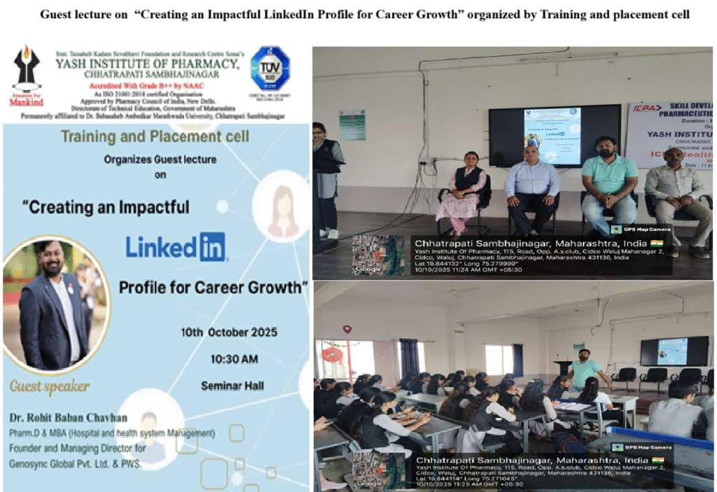 The Training and Placement Cell of Yash Institute of Pharmacy, Chhatrapati Sambhajinagar, organized an insightful Guest Lecture on the topic “Creating an Impactful LinkedIn Profile for Career Growth” on 10th October 2025 at 10:30 a.m. The session, specially arranged for Third Year and Final Year B. Pharmacy students, aimed to enhance their professional development and career readiness. The guest speaker, Dr. Rohit Baban Chavhan, Doctor of Pharmacy (Pharm.D) and MBA in Hospital and Health System Management, Founder and Managing Director of Genosync Global Pvt. Ltd. and PWS, guided students on building a strong LinkedIn presence, personal branding, and effective networking in the healthcare and pharmaceutical sectors. A hands-on practical demonstration encouraged students to create or update their LinkedIn profiles in real time, making the session highly interactive and engaging. The lecture provided valuable insights into digital professionalism and motivated students to leverage LinkedIn for career growth and professional networking. The event concluded with a vote of thanks by the Training and Placement Officer, appreciating Dr. Chavhan’s valuable contribution and inspirational session, which was well-received by all participants.