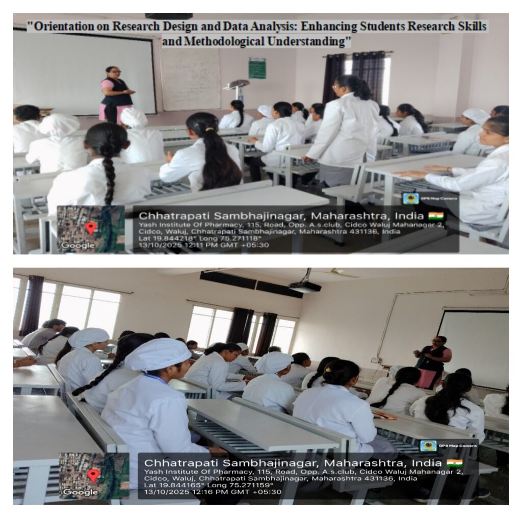 Yash Institute of Pharmacy organized an Orientation on Research Design, Data Collection, and Analysis on 13/10/2025. The session was conducted by Mrs. Dipali M. Kulkarni, who aimed to provide students with a clear understanding of research methodology, focusing on research design, systematic data collection, and effective data analysis. The session covered key topics such as types of research designs, formulation of research problems and hypotheses, sampling techniques, data reliability, and ethical research practices. Through interactive discussions and a Q&A session, students gained practical insights into preparing research proposals and conducting analytical studies. The orientation proved highly informative, enhancing students’ research skills, analytical thinking, and readiness for academic and project-based research work.