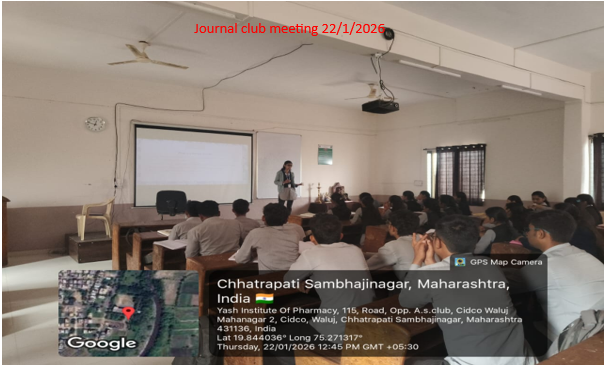 Yash institute of pharmacy organized journal club meeting on 22/08/2025 in this meeting Dr. Sumaiya Z. Khan emphasized the importance of research in academic and professional growth. She guided students on selecting suitable review and research-based project topics, highlighting innovative areas such as pharmaceutical formulation, pharmacology, clinical pharmacy, and nanotechnology. She encouraged students to prioritize novelty, feasibility, and relevance, and provided valuable insights on literature review, data collection, and research ethics.