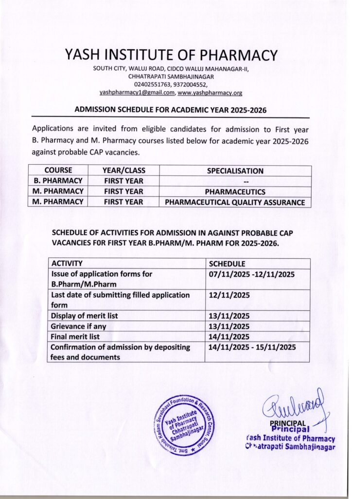 M. Pharmacy Admission Schedule 2025-26 Vacancy Position General Merit List Selection List Waiting List