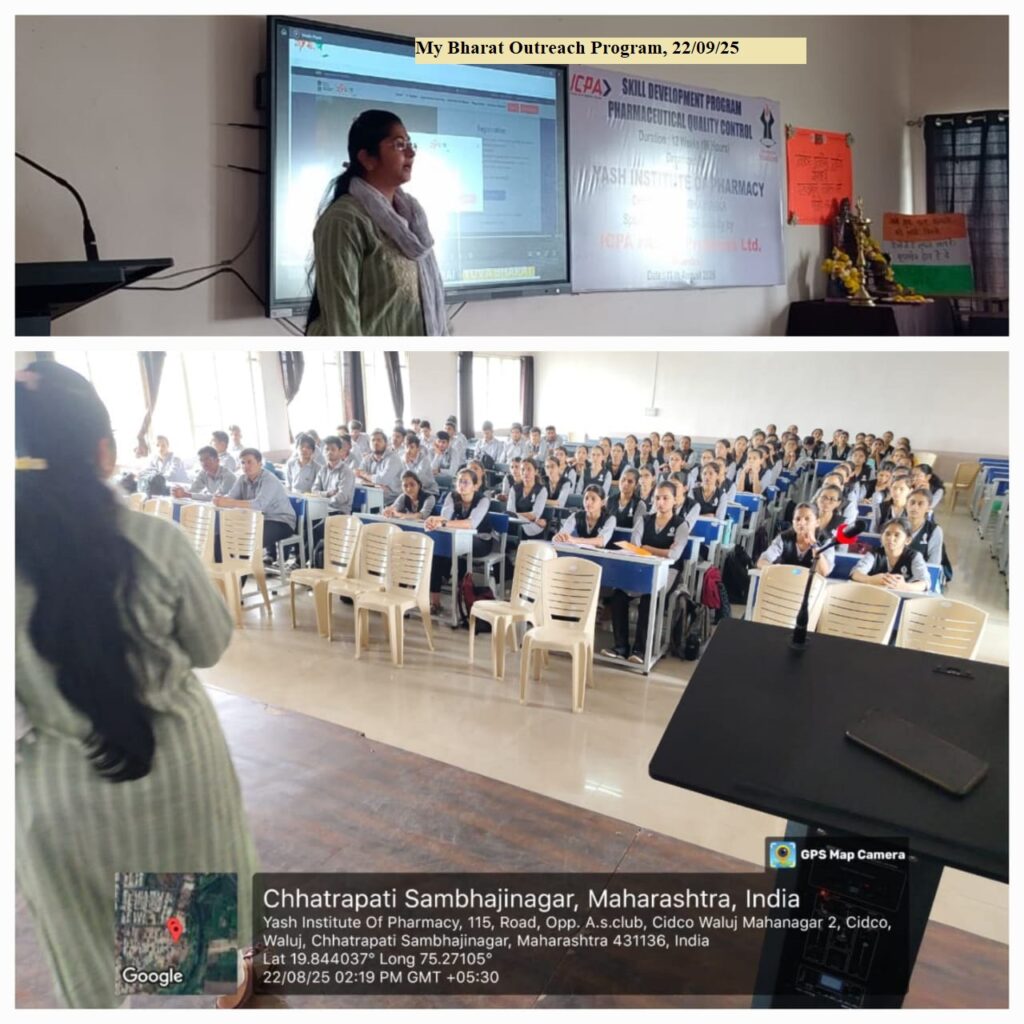 The NSS Cell of Yash Institute of Pharmacy organized the *My Bharat Outreach Program* on August 22, 2025, to raise awareness about the My Bharat Portal and encourage digital engagement among students. Conducted by NSS Incharge Ms. Laveena V. Makhija and Program Officer Dr. Vinod Udawant, the session featured a digital banner and a live video demonstration explaining the portal’s registration process and benefits. The program emphasized youth participation in nation-building and the use of technology for social development. It successfully enhanced students’ understanding of digital learning platforms, teamwork, and social responsibility, motivating them to actively engage in community service initiatives.