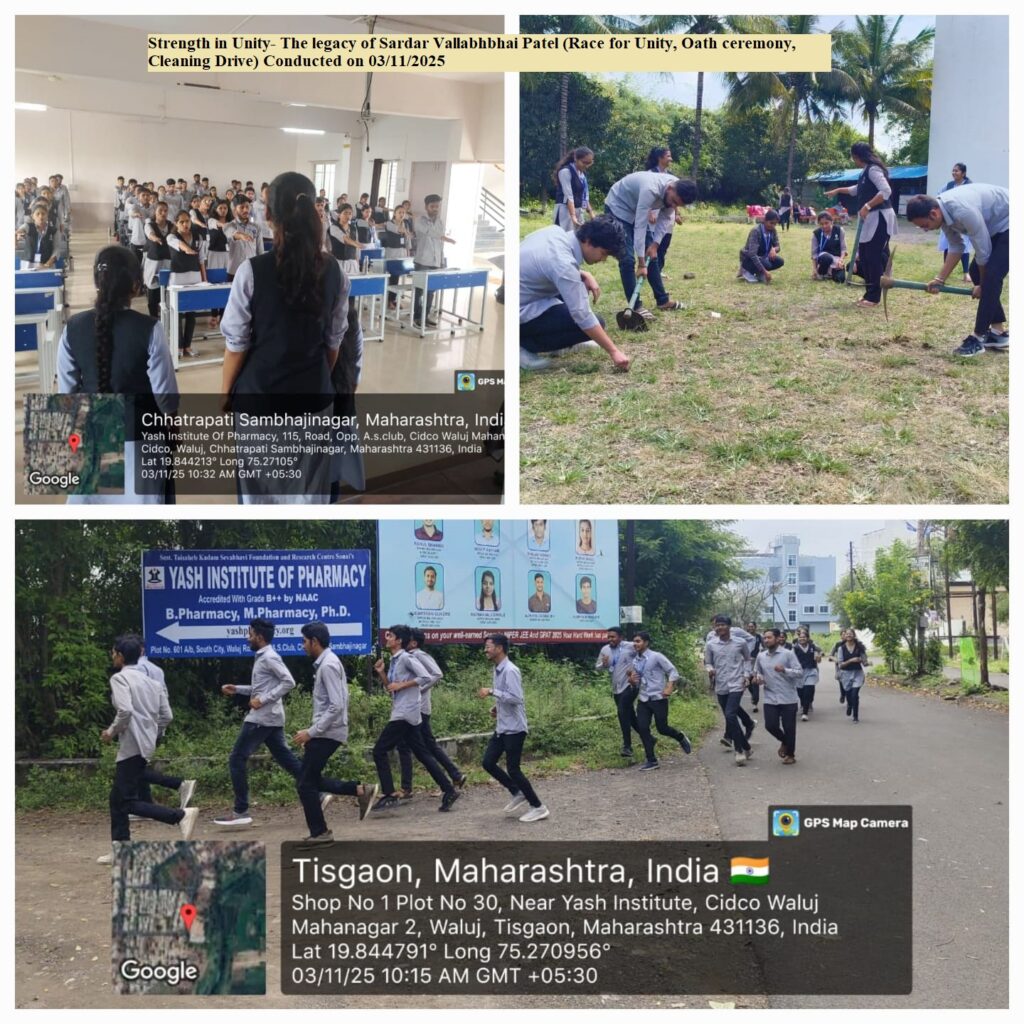 The NSS Unit of Yash Institute of Pharmacy organized a three-day celebration titled “Strength in Unity: The Legacy of Sardar Vallabhbhai Patel” from 31st October to 15th November 2025 to commemorate Rashtriya Ekta Diwas. The event featured a Race for Unity and Oath Ceremony, a Cleaning Drive, and a Vande Mataram song performance, all aimed at fostering national integrity, cleanliness, and patriotism among students. The celebration, graced by Mrs. Dipali Kulkarni and faculty members, inspired participants to embrace the spirit of togetherness, social responsibility, and environmental awareness. Overall, the program successfully instilled values of unity, discipline, and love for the nation within the campus community.