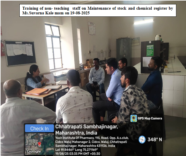 On August 19, 2025, a training session was conducted by Ms.Suvarna Kale mam at Yash Institute of Pharmacy for non-teaching staff on maintaining stock and chemical registers. The session focused on accurate data entry, safety protocols, labeling, and regulatory compliance. Through practical demonstrations, staff enhanced their skills in systematic record-keeping, improving efficiency, safety awareness, and preparedness for audits, while fostering a sense of responsibility and accountability.