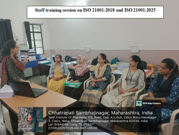 On September 13, 2025, a staff training session on ISO 21001:2025 was conducted at Yash Institute of Pharmacy by