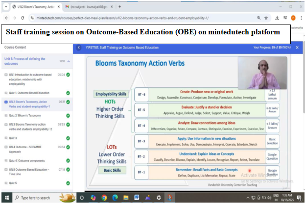 A staff training session on Outcome-Based Education (OBE) was conducted for teaching faculty using the Mint Edutech platform during the July–December 2025 session taken during August month. The training focused on aligning curriculum, formulating Course Outcomes (COs), mapping them with Program Outcomes (POs), and effectively using the platform for implementation and assessment. Faculty gained practical skills through hands-on activities and system demonstrations, resulting in improved understanding of OBE, enhanced teaching-alignment strategies, and strengthened readiness for quality assurance and accreditation processes.