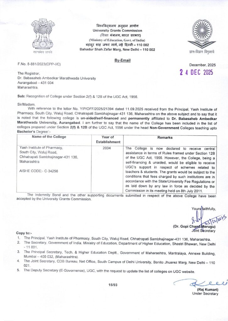 Yash Institute of Pharmacy, Chhatrapati Sambhajinagar, is duly recognized under Sections 2(f) and 12(B) of the University Grants Commission (UGC) Act, 1956. This approval signifies that the Institute fulfills the prescribed norms and standards of the UGC and is eligible to receive central assistance for academic development, research activities, infrastructure enhancement, and quality improvement initiatives. The 2(f) and 12(B) status reflects the Institute’s commitment to academic excellence, regulatory compliance, and continuous advancement in higher pharmaceutical education and research.